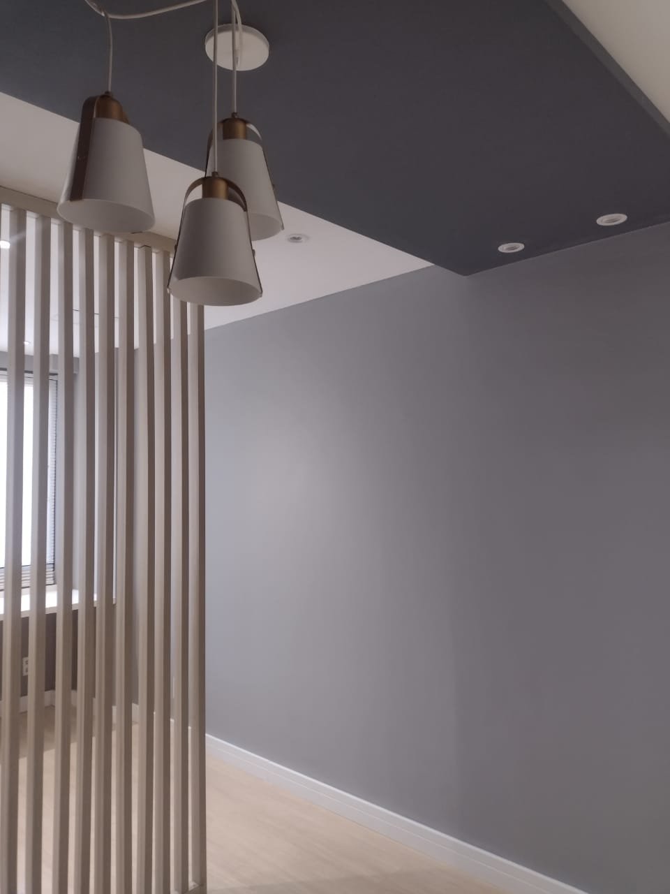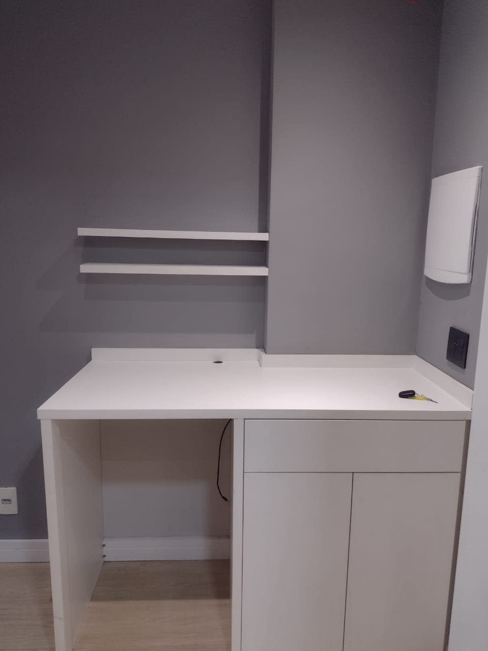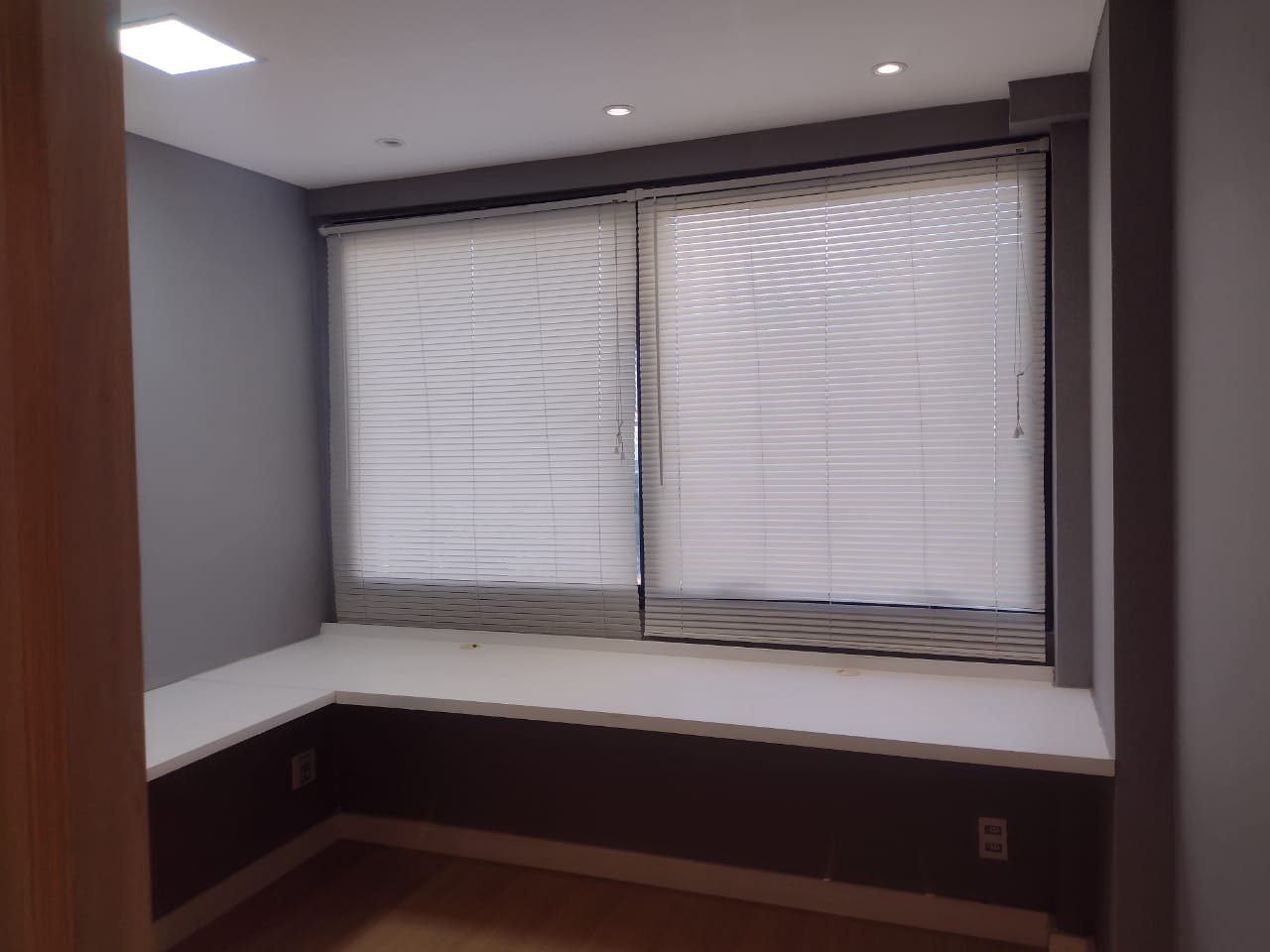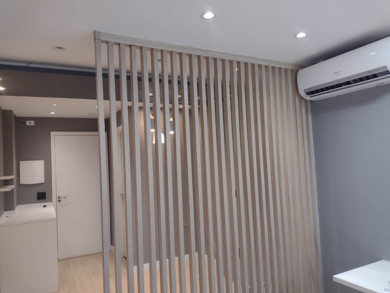 Excelente sala reformada para fins comerciais com 20 M, com 1 banheiro no chão com porcelanato trabalhado, sanitário e cuba de louça retangular na cor branca com torneira em aço escovado, sala com piso laminado na cor clara, teto com rebaixamento de gesso e luminárias embutidas, divisória modelo ripado de marcenaria de cor clara, duas grandes bancadas na cor branca, armário com duas portas e duas gavetas na cor branca, ar condicionado modelo split de 12.000 Btus e 3 luminárias modelo pendente na cor branca.